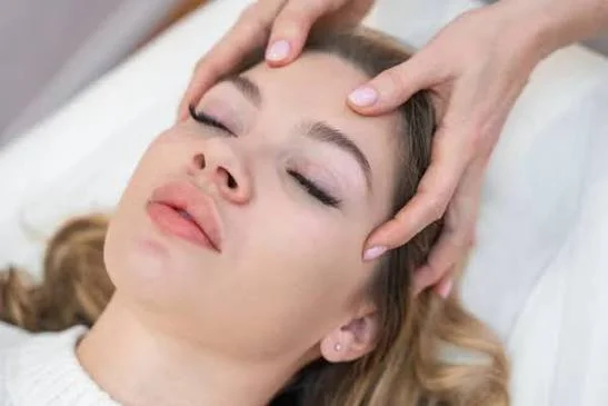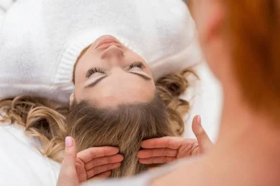 A vendég kényelmesen fekszik egy nyugodt, csendes környezetben kényelmes ágyon vagy fotelben, teljesen felöltözve, miközben a kezelő finoman érinti a fej meghatározott pontjait.